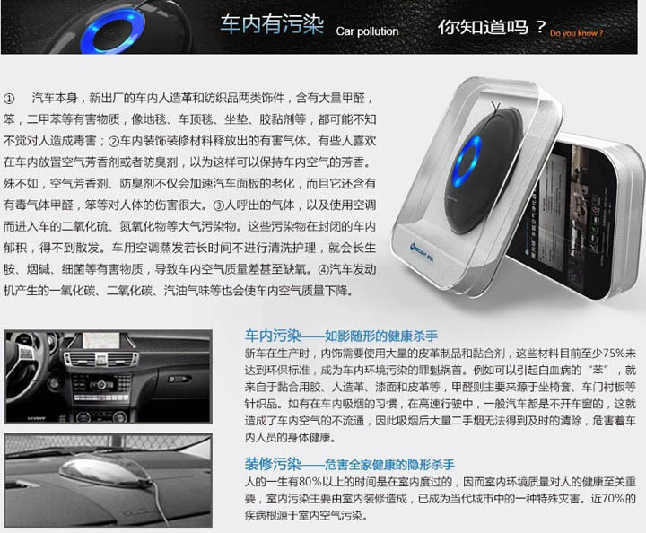 通过光解功能和释放大量负离子达到超强的除尘、杀菌、空气净化效果。同时负离子具有提神醒脑的功效,能帮助驾驶员消除疲劳和倦怠,产品既可以插入车内12V占烟器,也可以直接接入电及USB端口上使用无需更换配件,高效节能、零噪音。