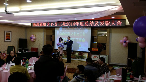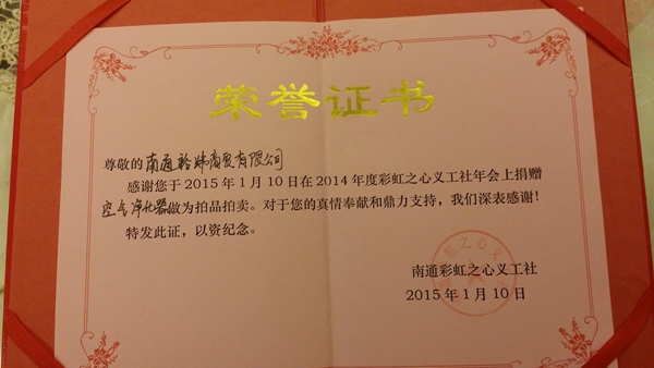 2015年1月10日,南通彩虹之心义工社2014年度大会在南通锦江花园酒店举行,南通裕炜商贸有限公司捐赠的拍品在大会上进行了拍卖,拍卖的善款全部进入爱心基金,用于公益事业。南通彩虹之心义工社是一个民间自发的公益组织,出发点是希望尽自己的能力去帮助有困难的人。以“专业、进取、感恩、快乐”为企业文化的南通裕炜商贸有限公司一直致力于参与社会公益事业,用爱心回馈社会。